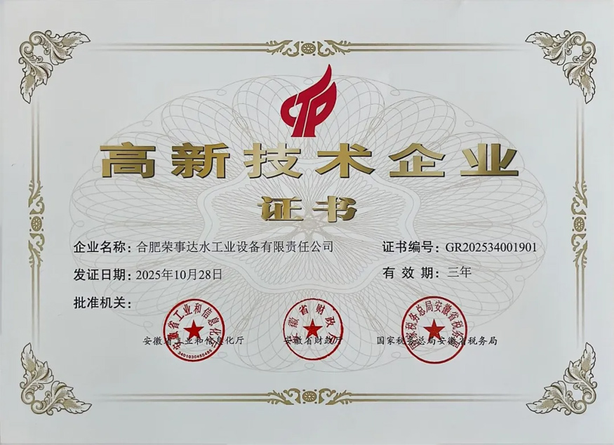 合肥榮事達水工業(yè)設(shè)備有限責(zé)任公司通過高新技術(shù)企業(yè)認定,榮獲由...